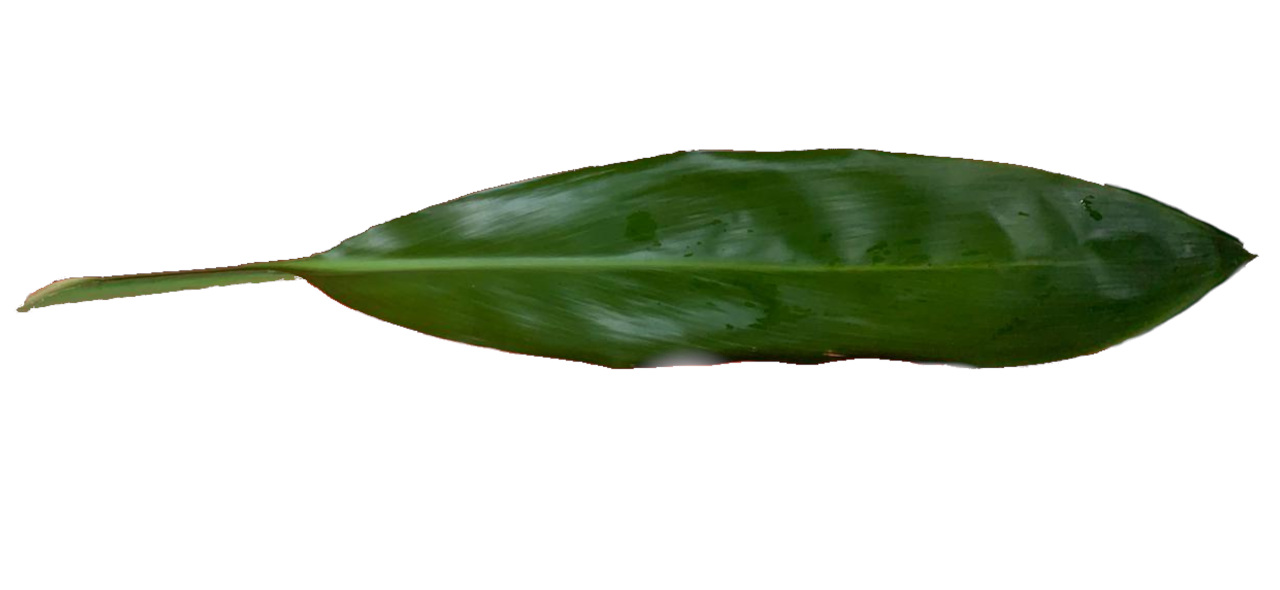 Banana leaves are large in size, ranging from 30 to 50 centimeters in width and reaching up to two meters in length, and have a wide-spreading, elongated nature. There are approximately 8 to 12 leaves per plant, and each leaf is broad, flat, and cylindrical with rounded edges. Banana leaves are waterproof, and a central midrib runs the length of the leaf, creating two laminas, or leaf halves, found on either side of the midrib. The leaves are not consumed and are discarded after cooking. Banana leaves are used as a food wrap and impart a subtly sweet, grassy, green, and vegetal flavor.